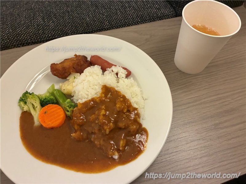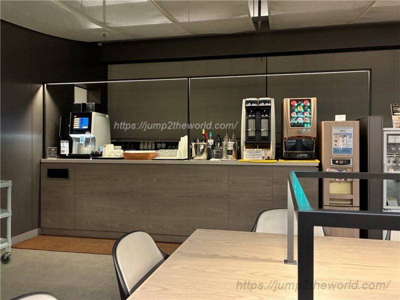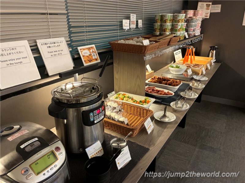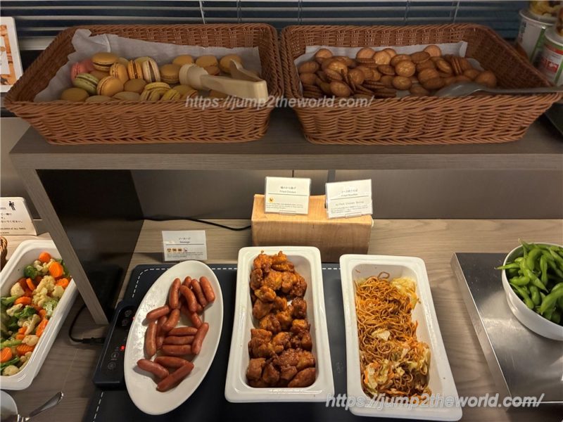 僕がラウンジを利用したのは平日の19時前後でしたが、利用客が多く良さげな席は埋まってたので、とりあえず空いてる席を確保して食料調達といきます。