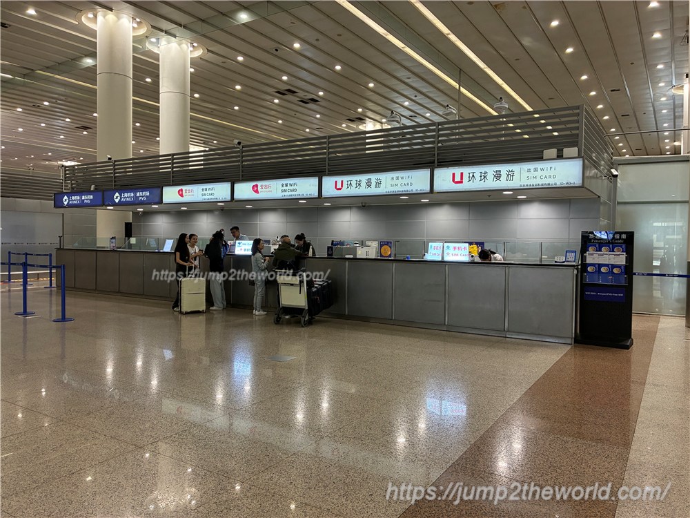 上海の浦東空港のターミナル1では、バゲージクレームまでの道中や到着ロビーにSIMカード販売店があります(上記画像)